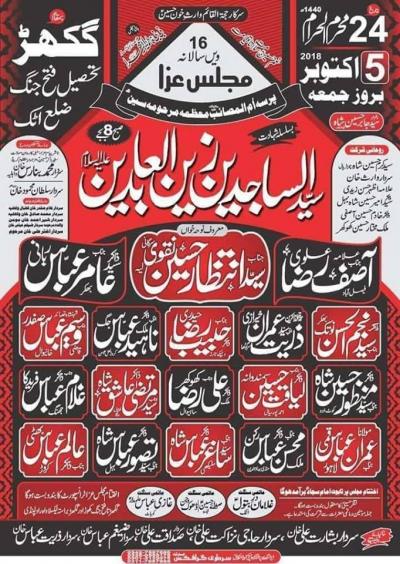 16th Annual Majlis e Aza Program Detail : 8am on 24th Moharram 1440 (5th October 2018) Address : Ghakkar, Tehsil Fateh Jang, Distt Attock
