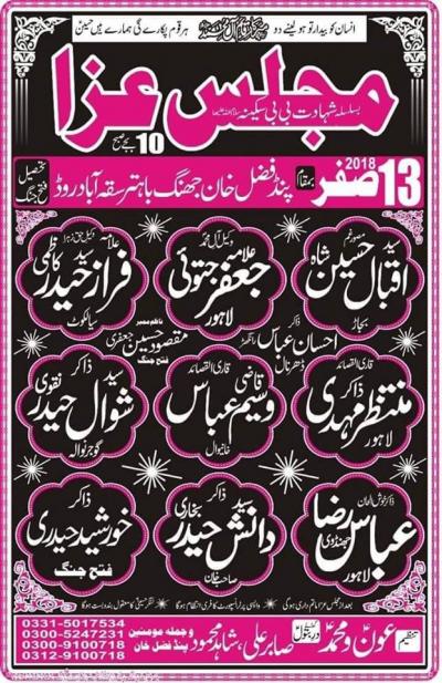 Majalis e Aza Program Detail : 13 Safar 2018 Address : Pind Fazal Khan, Jhang Bahtar, Saqa Abad, Tehsil Fateh Jang Contact for Details : 03315017534