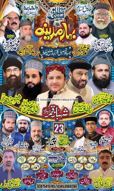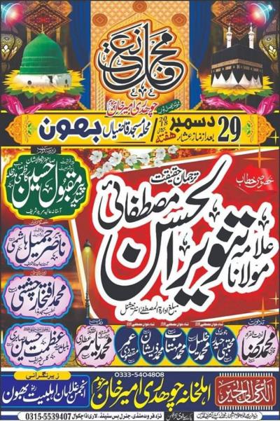 Sadarat : Pir Faisal Shehzad mervi Organizers : Muhammad Shiraz, Masood Ahmed and Muhammad Ashraf Address : Jamia Masjid Muhammadia Ghousia, Near Thenial Phatak, Chakwal Contact for Details : 0333 590 7 994
