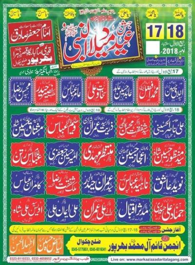 Jashan e Eid Milad un Nabi Program Detail : 17 and 18 Rabi ul Awal Organizers : Anjuman Qaim Aal e Muhammad, Bharpur, Talagang Address : Qadeemi Imam Bargah Qasr e Zahra, Bharpur, Distt Chakwal.