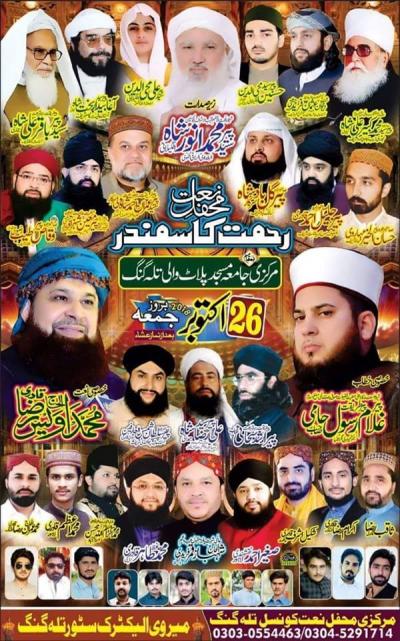 Sadarat : Pir Syed Muhammad Anwar Shah Organizers : Markazi Mehfil e Naat Council, Talagang Address : Markazi Jamia Masjid Plot Wali, Talagang Contact for Details : 03030554463