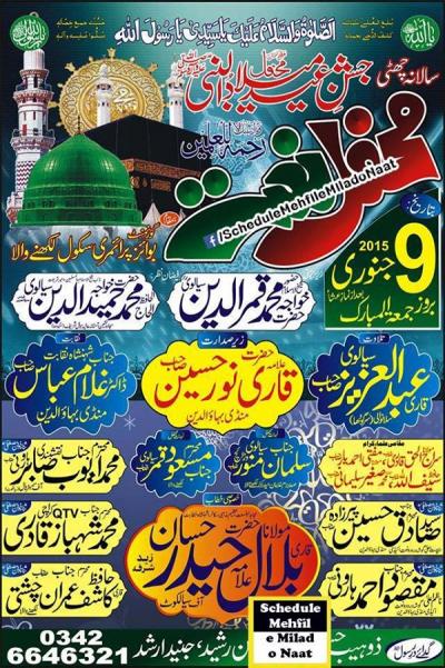 Annual 6th Jashan-e-Eid Milad ud Nabi Program Detail : Special address by Qari Moulan Bilal Haider Hasan of Sialkot. Zere Sadarat Qari Noor Husain So of Mandi Baha ud din. Organizers : Zohaib Hassan, Junaid Arshad Address : Govt. Boys Primary School, Lkhny Wala, Mandi Baha Ud Din Contact for Details : 0342 6646321
