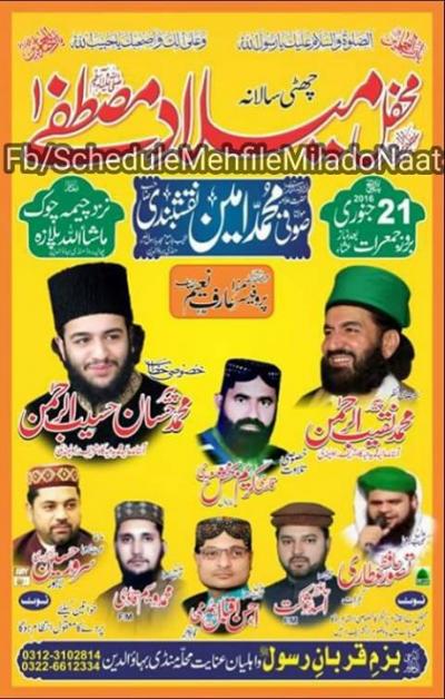 Mehfil.e.Naat (Karam Ki Raat) Program Detail : Naat Khawan:Qari Shahid Mehmood,Khalid Hasnain Khalid,Ahmed Ali Hakim Organizers : Anjaman Ghulaman.e.Mustafa Chimmon Address : Meelad Chok Chimmon (Mandi Bahauddin) Contact for Details : 03435943792