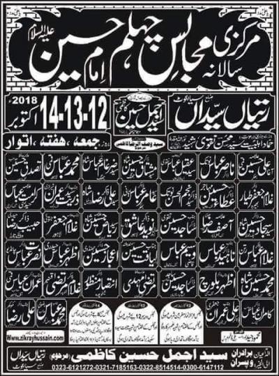 Markazi Salana Majalis e Chehlum Imam Hussain Program Detail : 12, 13 and 14 October 2018