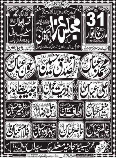 Majlas e Aza Imam Hussain Program Detail : Sunday, 31st March 2019 9am to evening Address : Imam Bargah Qasr e abu Talib, Mughle Check Syedan, Head Marala Road, Near Kalowal, Sialkot