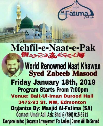 Mehfil-e-Naat-e-Pak Program Detail : World Renowned Naat Khawan From Pakistan Syed Zabeeb Masood on January 18th, 2019. Program starts from 7pm Organizers : Umair Adil Aziz Bhai, Masjid Al Fatima Edmonton, CA Address : Bait ul Iman Durood Hall, 3472-93 St. NW, Edmonton, CA Contact for Details : 780 915-5211