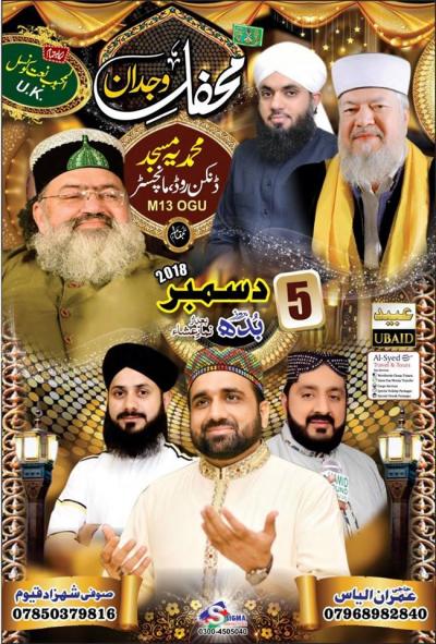 Mehfil e Wajdan Program Detail : Wednesday 5th December 2018 Organizers : Al Habib Naat Council UK Address : Muhammadia Masjid, Dunkan Road, Manchaster M13 OGU Contact for Details : 07850379816, 07968982840