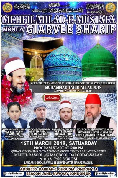 Mehfil e Milad e Musafa Program Detail : 16th March 2019 (6pm to 8:30pm) Address : Darbar-e-Ghousia,London 1-A, Beacon Lane, NW9 9AY, London, UK